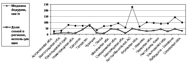 Результаты проведенных исследований подтверждают вполне очевидную корреляционную взаимосвязь между процентом домохозяйств, использующих йодированную соль и уровнем экскреции йода с мочой в популяции (коэффициент ранговой корреляции Спирмена (R) = 0,71; p = 0,001). К сожалению, употребление населением йодированной соли не соответствует рекомендациям международных экспертных организаций, лишь в одном из обследованных регионов доля домохозяйств, использующих йодированную соль, превысила