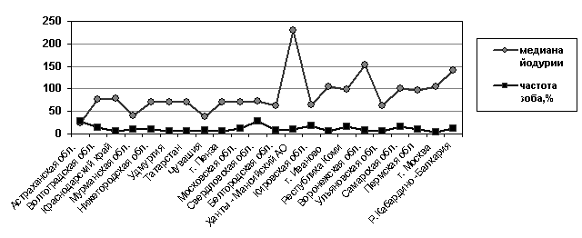 Оценка тяжести дефицита йода с использованием частотного распределения концентрации йода в образцах мочи совпадала с оценкой по медиане йодурии в подавляющем большинстве регионов (в 22 из 25 исследованных – 88%) (табл.3). Исключение составили Москва, Республика Кабардино-Балкария, Белгородская область. В последней показатели частотного распределения концентрации йода в образцах мочи соответствовали более выраженной степени дефицита йода, нежели показатели медианы йодурии (менее 20 мкг/л отмечено у 3% детей, отмкг/л – у 32%). В Москве, несмотря на показатели медианы йодурии, соответствующие йодобеспеченности по данным частотного распределения концентрации йода в моче, сохраняется дефицит йода в питании легкой (пограничной) степени выраженности. В Иваново показатели медианы йодурии и частотного распределения соответствовали нормальному уровню, однако оба показателя имели пограничное значение (медиана йодурии – 105,4 мкг/л, количество образцов с концентрацией йода 100 мкг/л и более составило только 47,7%). В Республике Кабардино-Балкария медиана йодурии соответствует уровню йодной обеспеченности, в то время как при анализе частотного распределения концентрации йода в моче выявлено, что более половины детей имеют йодурию ниже 100 мкг/л и 30% ниже 50 мкг/л. На момент проведения работы только в пятнадцати из исследованных районов были приняты региональные и областные целевые программы профилактики ЙДЗ, в семи принят и реализован план профилактических мероприятий, в трех профилактические мероприятия сводились только к санитарно-просветительской работе и носили нерегулярный характер. Из 25 регионов, относительно которых имелась информация о длительности проведения профилактических мероприятий, она составила менее трех лет в двадцати одном регионе, от трех до пяти лет – в двух регионах, более пяти лет – в двух регионах.