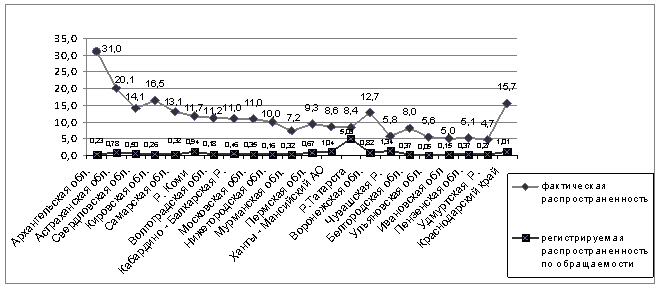 Было установлено, что за указанный период заболеваемость ДЭЗ у детей была различной в исследованных группах. Наивысшей она была у детей в подростковом возрасте (15 – 19 лет) 1151,6 [95% CI = 1021,6 – 1281,5] и превышала заболеваемость в средней и младшей возрастных группах соответственно (10– 14 лет – 707,7 [95% CI = 1021, 6 – 1281, 5]; 5 – 9 лет - 318,9 [95% СI = 297,4 – 340,4]) (p10-14л = 0,01; p5-9л = 0,05). Cравнительный анализ распространенности зоба, по данным официальной статистики и проведенного скринингового исследования, выявил, что фактическая распространенность ДЭЗ в большинстве регионов превышает регистрируемую в 10 раз (1,6 против 21,8%), а в некоторых областях, таких как Архангельская, Астраханская, Свердловская и Кировская, – более чем в 50 раз (рис. 6). Общая распространенность недиагностированного ДЭЗ, по данным скрининга, составила 11,9% [95% CI = 8,7 – 15,9]. Экстраполируя эти данные на население обследованных регионов, следует отметить, что число больных с невыявленным ДЭЗ составило только для обследованных регионов 58221 тыс. человек. Таким образом, результаты скрининга могут свидетельствовать о неудовлетворительной организации как диагностической, так и профилактической работы в большинстве регионов РФ.