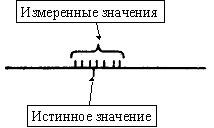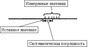 Систематические погрешности могут быть связаны с ошибками приборов (неправильная шкала, неравномерно растягивающаяся пружина, неравномерный шаг микрометрического винта, не равные плечи весов и т. д.) и с самой постановкой опыта. Они сохраняют свою величину (и знак!) во время эксперимента. В результате систематических погрешностей разбросанные из-за случайных погрешностей результаты опыта колеблются не вокруг истинного, а вокруг некоторого смещенного значения (рис.2). погрешность каждого измерения искомой величины можно предсказать заранее, зная характеристики прибора.