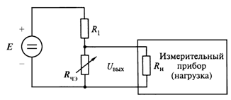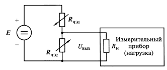 ЧЭ с сопротивлением RЧЭ включен последовательно с резистором R1, а питание осуществляется от источника E. Выходное напряжение схемы Uвых, измеряемое прибором с собственным сопротивлением Rн, равно: