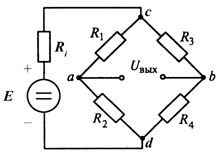 Нагрузка Rн включена в измерительную диагональ ab, источник питания E, Ri включен в диагональ питания cd. R1, R2 и R3, R4 – смежные плечи. Рабочие плечи могут быть оборудованы реостатными ЧЭ, тензорезисторами, терморезисторами и т. д. Мост может иметь одно, два или четыре рабочих плеча. Перед началом измерения, когда X = 0, мост устанавливается в состояние равновесия, при котором Uвых = 0. Условием достижения равновесия является: