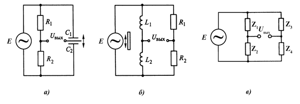 Схемы а и б называют комбинированными, т. к. они представляют собой комбинации двух потенциометров. Смежные плечи R1, R2 образованы постоянными сопротивлениями с активными импедансами. Другие плечи C1, C2 и L1, L2 образованы дифференциально включенными ЧЭ с реактивными импедансами. Приведем а и б к виду, показанными на схеме в, где плечи Z1, Z2, Z3, Z4 представлены комплексными сопротивлениями. При