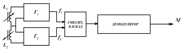 Т. к. недифференциальный ЧЭ трудно поддается температурной коррекции, то без значительного усложнения схемы практически невозможно избежать больших погрешностей измерения из-за температурного ухода частоты и влияния других дестабилизирующих факторов. Эти недостатки устранимы при использовании дифференциальных ЧЭ, включаемых в два колебательных контура, изменяющих свои частоты в разных направлениях (рисунок 2.56).
