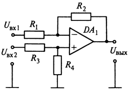 Один входной сигнал Uвх1 подается на инвертирующий вход, а второй Uвх2 – на неинвертирющий. Для обеспечения одинакового усиления по инвертирующему и неинвертирующему входам схема содержит делитель напряжения R3R4, выбираемый из условия R1/R2 = R3/R4. В результате получаем: