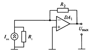 ЧЭ с токовым выходом, например фотодиод, представлен генератором тока Iвх и сопротивлением Ri. Входное сопротивление инвертирующего усилителя на ОУ dA1 весьма мало, поэтому он не оказывает обратного влияния на цепь, в которой измеряется ток. Кроме того, устраняется влияние емкости соединительной линии. Выходное сопротивление усилителя мало, как и у всякого усилителя с отрицательной обратной связью по напряжению. Выходное напряжение определяется по формуле:
