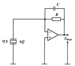 Схема является преобразователем заряда ΔQ, генерируемого ЧЭ, в напряжение Uвых. Усилитель реагирует только на приращение входного сигнала ΔQ. С помощью резистора R ограничивается снизу полоса пропускания усилителя. Низкое входное сопротивление усилителя позволяет исключить погрешности ЧЭ, вносимые нестабильной емкостью линии, соединяющей ЧЭ с усилителем. Выходное напряжение определяется по формуле: