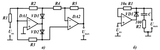 При конструировании измерительных схем датчиков используются выпрямители для получения постоянного или медленно меняющегося напряжения или тока. В зависимости от того, какой параметр переменного напряжения необходимо измерить, применяют выпрямители среднего значения и амплитудные. С целью уменьшения погрешностей преобразования, обусловленных нелинейностью вольт-амперных характеристик диодов, в точных выпрямителях используют операционные усилители (ОУ). Схемы выпрямителей на ОУ показаны на рисунке 2.61.