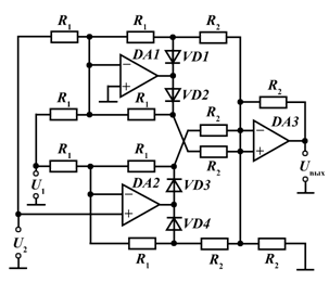 Выпрямитель по схеме на рисунке 2.62 имеет входы U1 и U2. Большее из поданных на эти входы напряжений является управляющим Uу и от него зависит знак Uвых. Модуль Uвых определяется меньшим входным напряжением. Целесообразно, чтобы R2 >> R1.