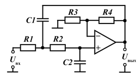В неинвертирующем включении ОУ обеспечивает относительно плоскую передаточную характеристику в полосе пропускания и крутой спад на частоте среза при соответствующем выборе R1, R2, R3, R4, C1, C2. Исходно задается частота среза фильтра