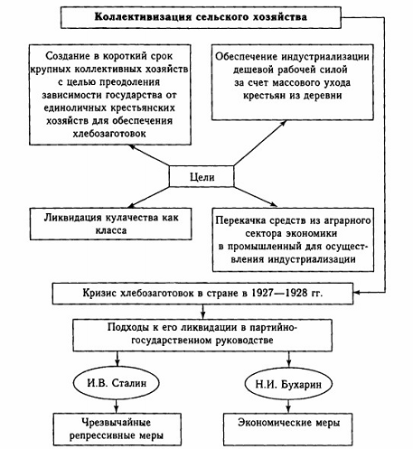 В глазах большинства руководителей, и в первую очередь , сельское хозяйство несло ответственность за экономические трудности еще и потому, что в промышленности показатели роста были вполне удовлетворительные (началась индустриализация и большая часть материальных средств вкладывалась именно в промышленность). Видимое отставание сельского хозяйства позволило объявить аграрный сектор главным и единственным виновником кризиса, поэтому аграрный сектор, по мнению большевиков, должен был быть реорганизован самым радикальным способом, заключавшимся в быстрой и решительной коллективизации. Большую часть крестьян-единоличников предполагалось объединить в коллективные хозяйства, и таким образом ликвидировать зависимость государства от частных хлебопоставок.
