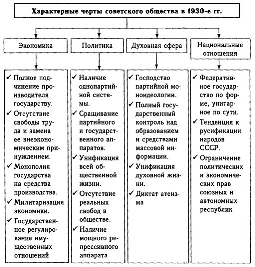 Самой распространенной концепцией интерпретации общественного строя, возникшего в СССР, стал тоталитаризм, т. е. государственный строй, осуществлявший полный контроль над всеми сферами общественной жизни. Сталинский режим был разновидностью государственного тоталитаризма, в условиях которого оформилась общественная система мобилизационного типа (См. таблицу 5 «Характерные черты Советского общества в 1930-е гг.»).