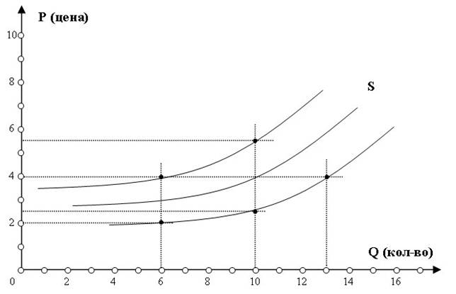 Как видоизменяется график предложения при увеличении предложения товаров (услуг) на рынке?
