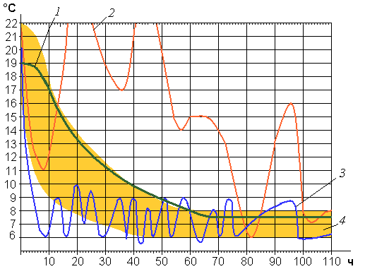 1 – динамика изменения температуры груза, установленная графоаналитическим расчётом с помощью предложенных формул; 2 – динамика колебания температуры наружного воздуха на маршруте по данным журнала наблюдений; 3 – динамика изменения и регулирования температурного режима перевозки; 4 – то же температурного поля штабеля груза