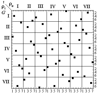 В третьей главе выполнено исследование влияния факторов на продолжительность охлаждения плодоовощей в рефрижераторных вагонах. В ходе исследований варьировались следующие факторы: масса груза в вагоне Gгр, температура наружного воздуха t, степень плотности штабеля ρш, степень скважности тары ρт (см. рис 2). С целью наиболее полного и равномерного охвата областей изменения указанных параметров использовалась теория планирования многофакторного эксперимента, предусматривающая разработку плана эксперимента (рис. 4) на основе ортогональных квадратов. Интервалы изменения варьируемых параметров приняты на основе практического опыта перевозок (табл. 1) и разбиты на 7 уровней.