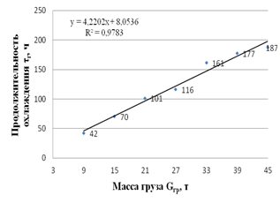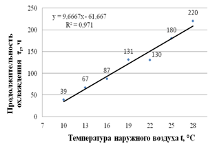 Известно, что продолжительность охлаждения плодоовощей в пути следования, является основной характеристикой теплообменных процессов в системе «окружающая среда – вагон – груз» и нормирована инструкцией по эксплуатации 5-вагонных рефрижераторных секций и автономных рефрижераторных вагонов. Её нормативное значение (60 ч) используется в актово-претензионной работе и в теплотехнических расчётах.