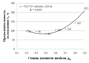 Как следует из графиков, существенное влияние на продолжительность охлаждения плодоовощей оказывает масса груза в вагоне, температура наружного воздуха и степень плотности штабеля. При изменении массы груза от 9 т до 45 т продолжительность охлаждения плодоовощной грузов может изменяться от 42 до 187 ч. Кроме того, при высокой начальной температуре плодоовощного груза, продолжительность охлаждения может увеличиться больше чем в 3 раза по сравнению с установленной в действующих инструкциях. Из перечисленных факторов управлению поддаются степень плотности штабеля и степень скважности тары. Влияние этих факторов на продолжительность охлаждения груза, сопоставимо с влиянием массы груза и температуры наружного воздуха. Это указывает на важность правильного размещения грузов в рефрижераторных вагонах, а также на применение воздухопроницаемых видов тары.