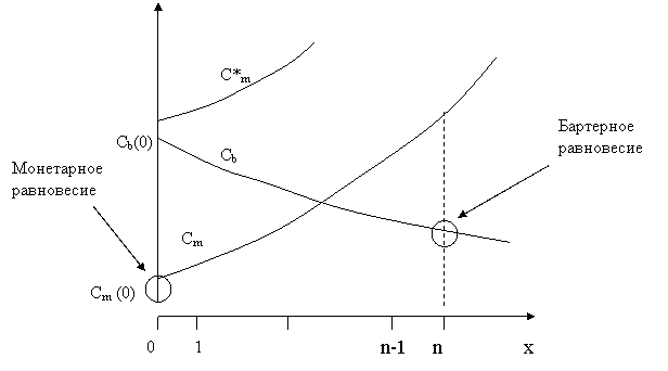 Если кто-нибудь в промежуточном равновесии решит увеличить объем трансакции по бартеру, то величина Cb уменьшается, трансакционные издержки по бартеру уменьшаются и всем выгодно переключиться на бартер, но при этом издержки бартерного обмена еще больше уменьшаются, значит это состояние оказывается доминирующим и устойчивым. То же самое рассуждение можно провести для отклонения в сторону монетарного обмена. Таким образом, промежуточное равновесие неустойчиво.