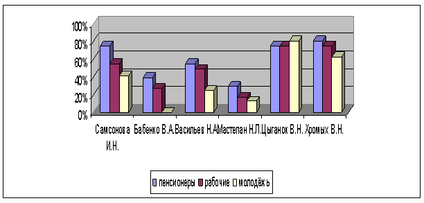 Собрав информацию о председателях, мне захотелось узнать, помнят ли мои односельчане председателей разных лет, отличительные черты их работы, кто землякам запомнился больше и какими делами. Я составила анкету и провела опрос среди населения. Односельчан разделила на три группы: пенсионеры ( от 55 и более лет), рабочие ( от 25 до 55 лет), молодёжь ( от 17 до 25 лет). В каждой группе было опрошено по 16 человек. (Приложение 1).