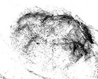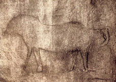 Фигура лошади, выполненная черной краской на западной стене Зала Рисунков. Нижнее прорисованное фото было опубликовано в журнале «Вокруг Света», № 3, 1960. Верхний снимок, предоставленный нам , подтверждает факт существования черных изображений в Каповой пещере