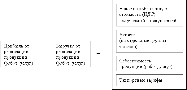 Прибыль (убыток) от реализации продукции (работ, услуг) определяется как разница между выручкой от реализации в действующих ценах без НДС и акцизов и затратами на производство и реализацию продукции. Предприятия, осуществляющие экспортную деятельность, при начислении прибыли из выручки от реализации продукции исключают экспортные тарифы (рис. 1.2).