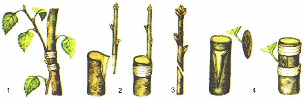 Окулировка. Прививка почки-глазка. На подвое делается Т-образный разрез, края коры отгибаются, и за кору вставляют почку с небольшим участком древесины и плотно забинтовывают.