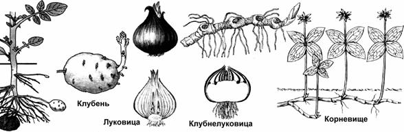 Клубень. Из сельскохозяйственных растений, размножающихся клубнями, наиболее известны картофель и топинамбур. Их можно размножать, высаживая целые клубни или их части с почками-глазками. Клубни, как хранилище запаса питательных веществ, образуются у таких дикорастущих растений, как сыть, седмичник.