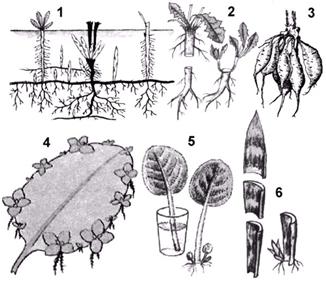 Способы вегетативного размножения. Растения можно размножать вегетативными органами – делением целого растения на части, надземными и подземными побегами, листьями, корнями.