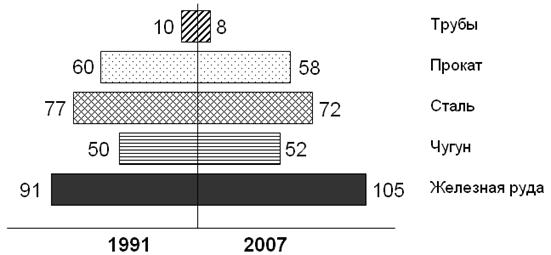 Удельный вес черной металлургии в структуре промышленного производства России за прошедший период изменился мало (7,9 % в 1991 г. и 8,4 % в 2007 г.), но её внутренняя структура трансформировалась. Спад 1992–1998 гг. и последующий подъём 1998–2007 гг. носили неравномерный в отраслевом разрезе характер, результатом чего стало повышение доли низших «этажей» – добычи железной руды и выплавки чугуна – в структуре российской чёрной металлургии при относительном снижении роли её верхних «этажей» – производства стали, проката, труб (Рис.1). Если по добыче железной руды и производству чугуна к 2007 г. показаг. были превышены соответственно на 15 % и 4 %, то по выплавке стали, производству проката и труб сохранялось отставание от исходного уровня в диапазоне от 4 % до 20 %.