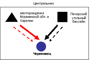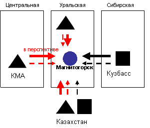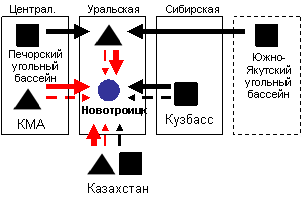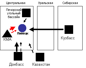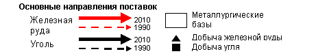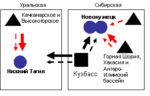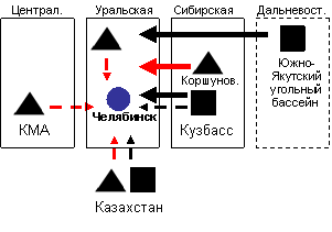 Основные направления изменений следующие: прекращены поставки угля из Казахстана, снабжавшего предприятия Уральской и Центральной металлургической базы, на смену которому пришел кузбасский, печорский и южно-якутский уголь; к кузбасским углям, которыми традиционно снабжались предприятия Уральской и Сибирской металлургической базы, добавился уголь с Печорского и Южно-Якутского угольных бассейнов; произошло замещение уральской железной руды на руды с КМА и Сибирской металлургической базы (Горная Шория, Хакасия, Ангаро-Илимский бассейн).