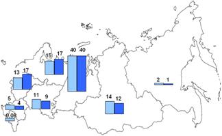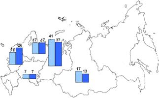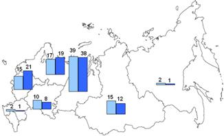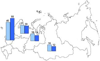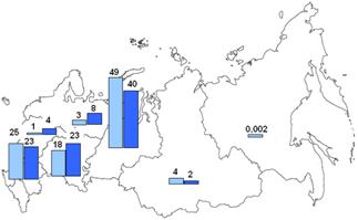 За тот же самый период времени доля Дальневосточного федерального округа в производстве стали и проката снизилась наполовину. В Южном федеральном округе производство стали сократилось на 1/5, готового проката – наполовину, труб – почти на 1/10. В значительной мере это было связано с закрытием здесь ряда предприятий передельной и малой металлургии. Из-за нерентабельности был закрыт ряд металлургических заводов и в Сибири.