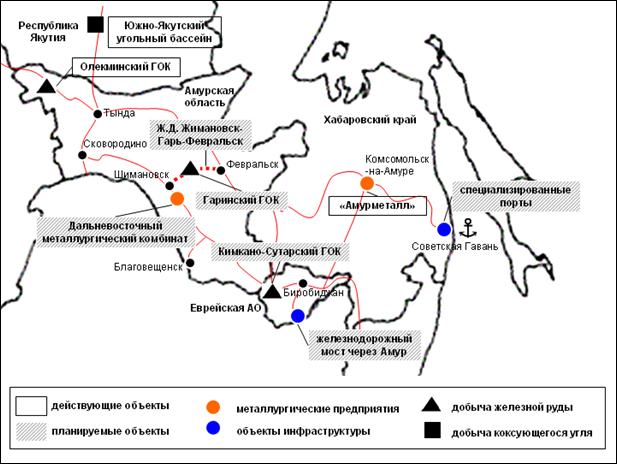 Реализация полномасштабного проекта ведется с 2003 г. В 2010 г. было введено в строй предприятие по добыче железной руды – Олекминский ГОК (ильменитовый и титаномагнетитовый концентрат) на базе Куранахского месторождения в Амурской области. В 2013 г. планируется ввести в строй Кимкано–Сутарский ГОК в Еврейской автономной области, в 2015 г.– Гаринский ГОК. Запасы железных руд на данных месторождениях – порядка 1600 млн. тонн – сопоставимы с запасами Костомукшского (Республика Карелия) и Оленегорского (Мурманская область) месторождений. Производственную цепочку завершит Дальневосточный металлургический комбинат (ДВМК), который будет производить из концентратов Кимкано–Сутарского и Гаринского ГОКов с использованием местных углей до 2,5 млн. т/год железа прямого восстановления по инновационной технологии. На Дальневосточном металлургическом комбинате в Амурской области будут построены два модуля общей мощностью 1 млн. т/год железа прямого восстановления. Заинтересованность в его продукции уже проявила компания «Амурметалл». В дальнейшем на базе ДВМК возможно создание собственного сталелитейного производства. Гранулированный чугун, выпускаемый ДВМК, может быть использован в качестве сырья для электрометаллургического производства стали.
