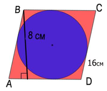 №2 Из металлической пластины, имеющей форму ромба со стороной 16 см и высотой 8 см вырезали круг наибольшей площади. Сколько процентов материала пошло в отходы?