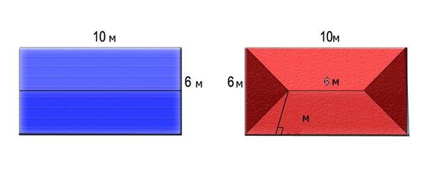 №4 В соответствии с проектом дом, имеющий на плане форму прямоугольника со сторонами 6 м и 10 м, намечалось завершить двускатной крышей. Для уменьшения объема чердака было решено, не изменяя величины площади крыши, сделать ее четырехскатной с попарно равными противоположными скатами. Вычислить площадь крыши (боковые скаты – равносторонние треугольники)