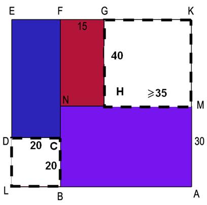 Требуется разместить на земле участок площадью 3100 м2, который состоит из трёх прямоугольных частей и имеет форму многоугольника ABCDEFGHM, у которого BC=CD= 20 м, GH=40м, AM=30м, EG=15м, HM≥35м.