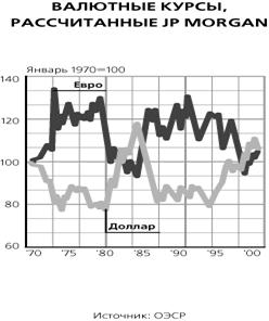 Поскольку валютные рынки склонны к гиперболизации, можно представить себе, что размеры дальнейшего вздорожания евро будут значительными. Это бы соответствовало историческому опыту. После отмены в 1971 г. Бреттон-Вудской системы фиксированных валютных курсов, доллар пережил два длительных периода падения (в 70-е гг. и в 1985 — 1995 гг.) и два периода роста (в первые годы президентства Рейгана и после 1995 г.). Вопрос в том, означает ли нынешняя слабость доллара и, соответственно, сила евро начало нового периода.