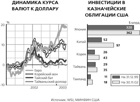 Однако экономики Восточной Азии, в особенности Китай и Япония, будут сопротивляться повышению курса своих валют. Японские резервы в ноябре прошлого года составили $460,5 млрд — на $58,5 млрд больше, чем в конце 2001 г. Остается разве что евро. Но и здесь дальнейшее удорожание едва ли будет приветствоваться. Оно может потребовать серьезных перемен в политике Европейского Центробанка. Кроме того, укрепление евро чревато кризисом, особенно в Германии.