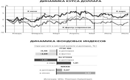 Курс доллара по отношению к ведущим мировым валютам практически беспрерывно падает с марта. Череда скандалов, связанных с искажением финансовой отчетности крупнейшими американскими компаниями, поколебала привлекательность американского фондового рынка в глазах инвесторов. Вложения в акции и облигации американских компаний сократились, и финансировать огромное отрицательное сальдо торгового баланса стало нечем.