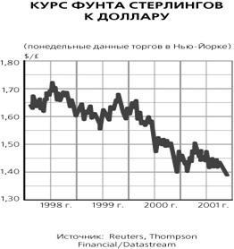 Курс фунта упал ниже отметки $1,4 и опустился до $1,3932 — самого низкого уровня с февраля 1986 г. В четверг падение продолжилось, и на дневных торгах в Лондоне фунт стоил уже $1,3842; курс евро к британской валюте также укрепился, поднявшись до 0,6122 фунта с 0,6008 фунта на вечерних торгах в Нью-Йорке. Аналитики предсказывают фунту стерлингов нелегкую судьбу, поскольку позиция лейбористов по вопросу вступления Великобритании в зону евро остается неясной. При этом некоторые факторы говорят о том, что они могут форсировать обсуждение этой проблемы. «Мы прогнозируем курс $1,3 на конец II квартала, — говорит Тим Мейзанек из бостонской финансовой компании Investors Bank and Trust. — Вряд ли в ближайшем будущем курс вернется к отметке $1,4 и превысит ее».