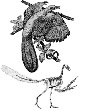 Археоптерикс «древесный» и археоптерикс «наземный»В настоящее время большинство специалистов считают, что исходной группой пресмыкающихся, давшей начало птицам, были ящеротазовые динозавры из группы теропод (Theropoda) – наземные хищники, передвигавшиеся на двух ногах. А наиболее близкими к птицам, если исходить из известных особенностей строения, были дромеозавры (Dromaeosauridae) – одно из семейств теропод, включавшее, в частности, «воспетого» Стивеном Спилбергом велоцираптора (Velociraptor) и открытого в 1964 г. дейнониха (Deinonychus). Последний, как и некоторые другие дромеозавры, как предполагают, мог быть покрыт перьями и иметь весьма высокий уровень обмена веществ, обеспечивающий теплокровность.