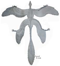 Отпечаток скелета микрораптора. Реконструкция, опубликованная в журнале NatureНа плюсне (задняя конечность), перпендикулярно к ней, располагается по крайней мере 14 длинных контурных перьев, крайние из которых имеют наибольшую длину (вдвое длиннее бедра) и асимметричное опахало... На плюсне имеются и покровные перья, расположенные здесь гуще, чем на передней конечности... Контурные перья присутствуют также на голени, хотя здесь они короче, чем на плюсне... В целом оперение задних конечностей также напоминает оперение крыльев современных птиц... Рулевые (хвостовые контурные) располагаются от середины и до конца хвоста. Последние из них имеют длину 10–12 см...» Далее китайские палеонтологи отмечают, что асимметричность опахал маховых перьев, очевидно, улучшающая аэродинамические свойства всей конструкции, является явным приспособлением к полету. Полет микрораптора, однако, был планирующим – ящер вел древесный образ жизни и перелетал на своих четырех крыльях с ветки на ветку или с дерева на дерево, подобно современным летягам. Такими же особенностями, по словам авторов удивительной находки, обладали, вероятно, и более древние существа, эволюционная радиация которых привела как к становлению дальнейшего разнообразия дромеозавров, так и к возникновению птиц. По мере эволюции последних и освоения ими машущего полета с помощью передних крыльев, задние постепенно редуцировались. Здесь надо напомнить, что помимо вопроса о систематической принадлежности предков птиц неясным остается и характер возникновения у этих предков самого механизма машущего полета. Споры по этому поводу ведутся уже более ста лет. Приведенная выше точка зрения (ее придерживался и предсказавший существование «тетраптерикса» У. Биб) – постепенное совершенствование планирования, а потом и перепархивания с дерева на дерево у древесных существ – встречает яростные возражения других ученых. По их мнению, стремительно бегавшие дромеозавры «взлетели» с земли – балансирование на бегу расставленными конечностями приводило к возникновению определенной подъемной силы, а прыжки в попытках поймать «руками» летающую добычу способствовали развитию настоящих крыльев.