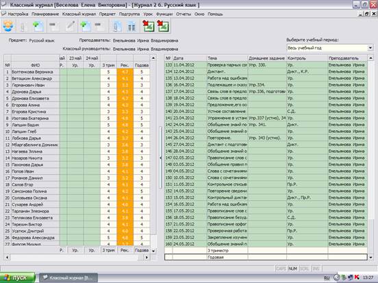 Приложение «Классный журнал» используется для создания поурочно-тематических планов и ведения непосредственно классных журналов учебных коллективов, а также кружков, секций и т. п.Приложение использует данные введённые ранее в следующих приложениях программного комплекса: