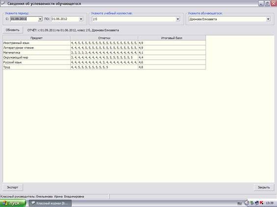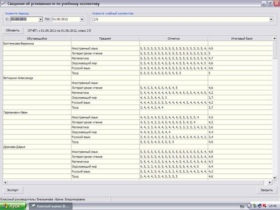 Фрагмент электронного журнала, представленного в виде текстового отчета одного из показателей успеваемости