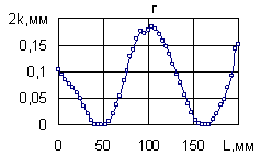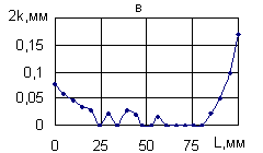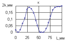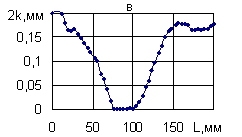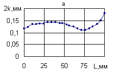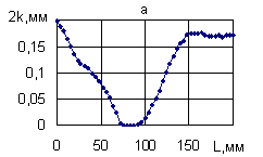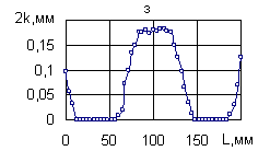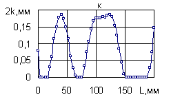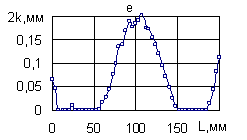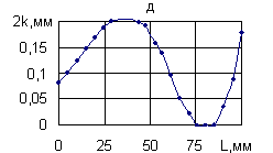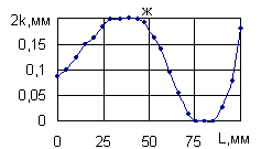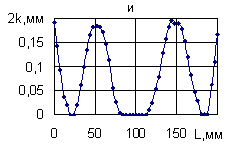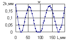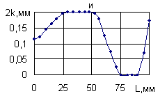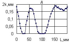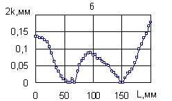 У толкателя длиной 205 мм при Р = 500Н на участке (50…150) мм (рис. 3.12, б и 3.12, г) наблюдается просто увеличение начального локального прогиба до максимально возможного, равного зазору между толкателем и направляющими; на участке (0…80) мм, близком к прямолинейному (рис. 3.12, в), при Р = 1500Н происходит образование двух полуволн (рис. 3.12, д); на участке (150…200) мм, который также близок к прямолинейному (рис. 3.12, а, в, д), при Р = 2500Н формируется одна полуволна (рис. 3.12, ж). С увеличением сжимающей силы до 5000Н участок этого толкателя (0…80) мм снова теряет устойчивость