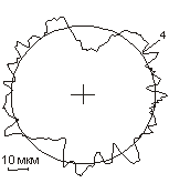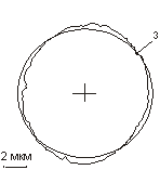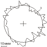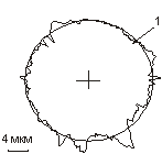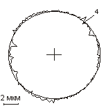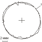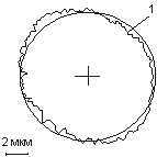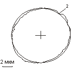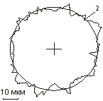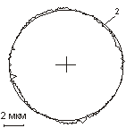 Рис. 5.6. Круглограммы отверстий в заготовках из стали 20Х, полученные на различном расстоянии (Li) от входного торца заготовки: а – после сверления (диаметр отверстий 2,025…2,080 мм); б – после двухциклового дорнования (прошивками диаметром 2,116 и 2,136 мм); в – после четырехциклового дорнования (прошивками диаметром 2,116; 2,136; 2,166 и 2,18 мм); 1 – Li=2мм; 2 – Li=34 мм; |