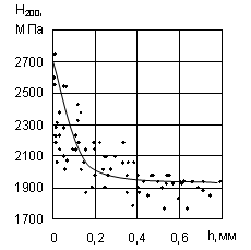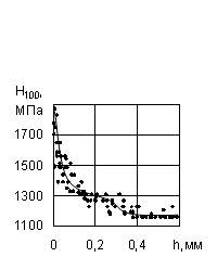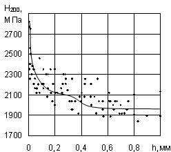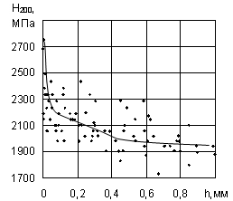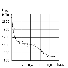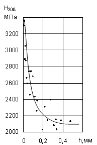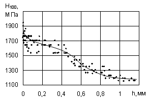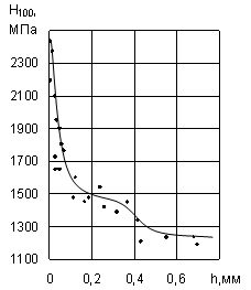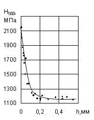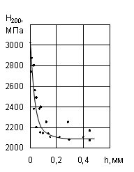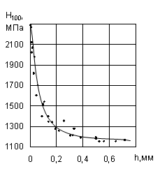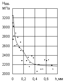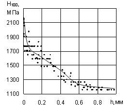 Рис. 5.11. Распределение микротвердости по толщине поверхностного слоя отверстий (d=1,2 мм, L=5 мм) в заготовках из стали45: |