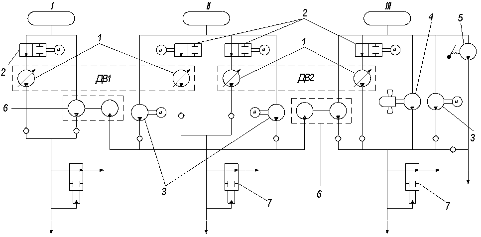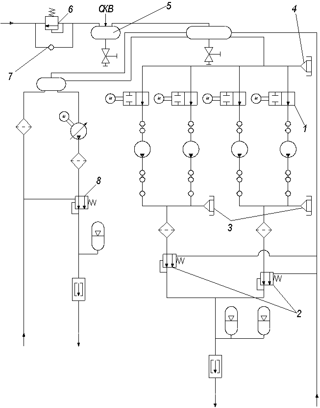 За каждым блоком установлен подпорный клапан 7, обеспечивающий приоритет работы системы управления.
