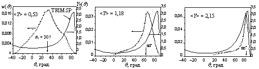 Сопоставление графиков зависимостей wi(q) и YT(q) на рис. 4 дает наглядное представление о влиянии ионно-индуцированного микрорельефа на распыление мишени. Причем это влияние существенно зависит от значения номинального угла падения qi ионов на мишень. В частности, широкие распределения локальных углов падения wi(q) при номинальных углах, близких к нормальному падению (см., например, qi = 30º), приводят к значительному возрастанию коэффициента распыления <Y>i шероховатой поверхности по сравнению с соответствующим значением для гладкой поверхности.