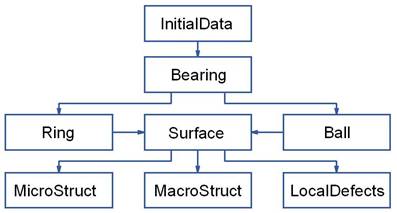 Данный объект содержит данные характеризующие условия работы (скорость вращения колец, радиальную нагрузку, длительность и дискретизацию сигнала) и объект класса Bearing. Класс Bearing содержит объекты классов Ring и Ball описывающие геометрию колец и тел качения, данные характеризующие свойства конструкционных материалов, а так же методы проверяющие условия сборки подшипника. Геометрия поверхности описывается тремя классами MacroStruct – макроотклонения, MicroStruct – микрогеометрия (шероховатость), LocalDefects – локальные дефекты. Для задания макроотклонения используется общепринятое уравнение зависимости Rпов от угловой координаты