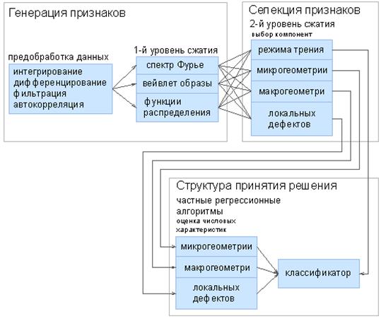 По каждому набору признаков строятся частные решения задач регрессии, определяющие качественные и количественные параметры дефектов, режимов работы, а также вероятность (достоверность) их присутствия.
